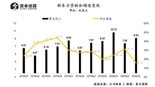 财报显示,新东方2020财年第三季度的营收和净利润录得双位增长。其中,营业收入为9.232亿美元,同比增长15.9%,环比增长17.6%。从过往三个财年的数据可以看出,新东方营业收入的同比增速呈放缓趋势,结合下一季度的业绩指引,接下来的营收同比变化会更加不乐观。