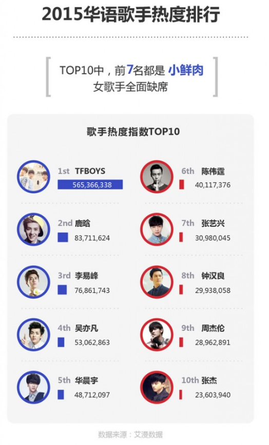 而在2014年年底发布的腾讯娱乐白皮书中,TFBOYS跻身连续三年被“超女快男”所垄断的内地唱片销量TOP3,同时在选秀歌手占半壁江山的新人热度排行中名列前茅。尽管三小只出道初期也争议颇多,但电视时代的权威意见在被打破。