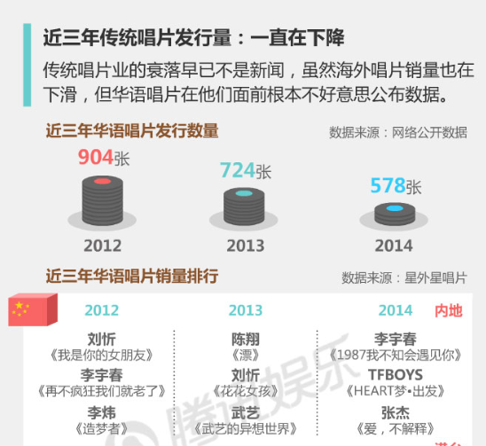 TFBOYS跻身连续三年被“超女快男”所垄断的内地唱片销量TOP3(图片来源:2014年腾讯娱乐白皮书·音乐篇)