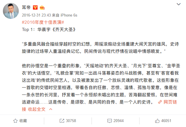 作为一位普通的听众,如果换到华晨宇“领军人物”的争议上,这个期许可以换成:希望没有华语乐坛领军人物,因为这喻示我们进入了百花齐放的时代。“领军人物”这旗帜再飘扬,都不如好音乐留得久、传得远。
