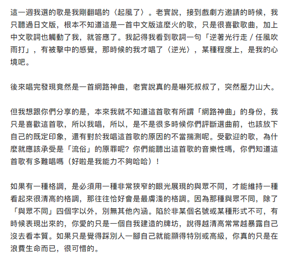 吴青峰发微博为《起风了》解释——“受欢迎的歌,为什么就应该承受是‘流俗’的原罪呢?”