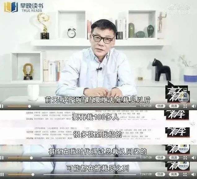 此前的4月22日,李国庆在视频节目《言之有李》中表示,听说当当要裁员100多人,很多自己招的,或者得到过自己的总裁认同奖的员工也在被裁之列。“当然我现在只是股东,我不干预当当总裁的决定。”他表示企业应当慎重裁员,原因包括员工的招聘时间、融入时间都很长,以及裁员不利于企业凝聚力。