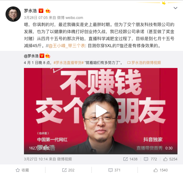 在第一次直播前,3月28日,老罗就在微博高调宣布 “科学减肥”计划,提出“90天瘦45斤”的目标。卖什么产品,说什么话,玩什么梗,都是团队精心设计的,老罗为什么要埋下“老罗减肥”的故事线呢?