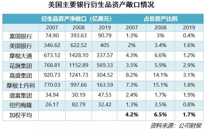 2008年之后监管政策加大了对银行金融机构自有资本投资相关衍生品的限制,表中可以看到,当前美国大型银行与利率、汇率、股票等相关的衍生品资产占比远远低于2008年。因此,从金融机构持有的高杠杆的衍生品资产占比角度来看,目前由于风险资产剧烈波动而导致的美国主要金融机构的破产风险很低。