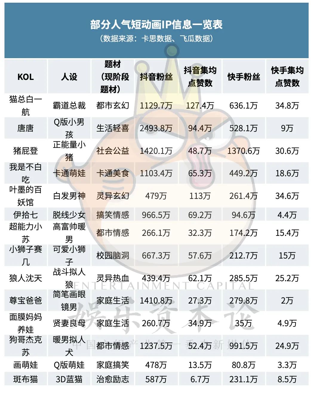 预言家游报整理了部分在抖音、快手平台上比较有人气的短动画IP名单。