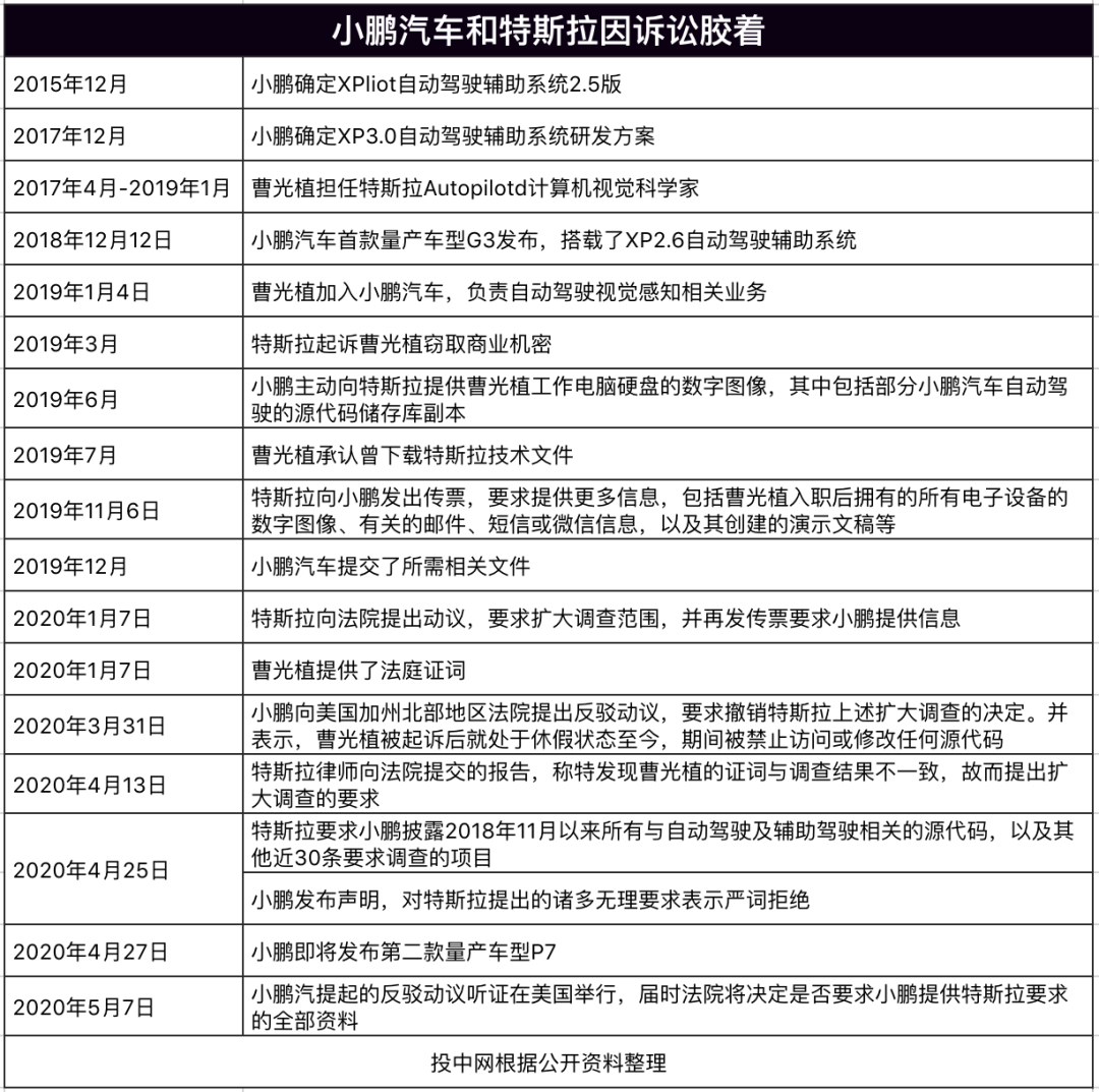 2020年4月13日,特斯拉的律师向法院提交的报告,称特发现曹光植的证词与调查结果不一致,故而提出扩大调查,并要求小鹏提供2018年11月至今自动驾驶系统完整源代码数据库,同时提供公司创始人何小鹏等多名员工的硬盘数据等信息。