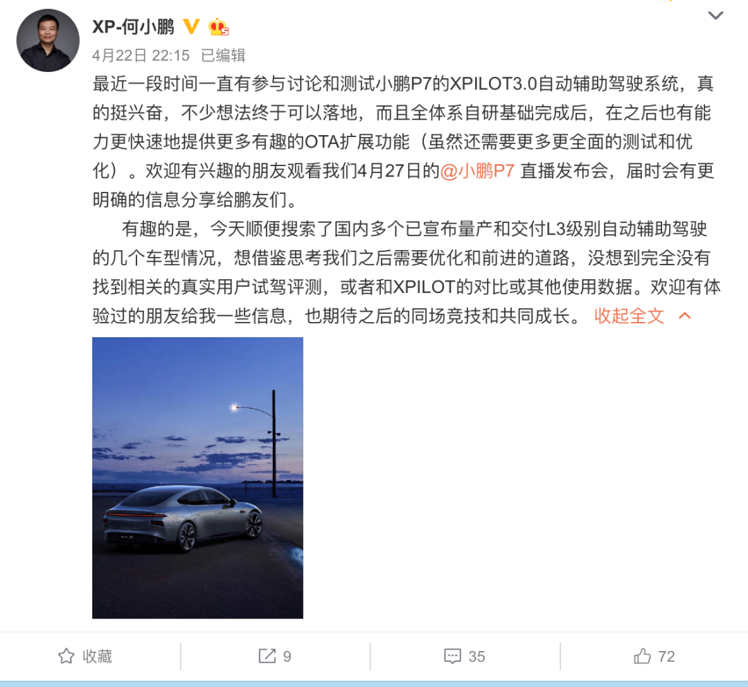 小鹏创始人何小鹏也在4月22日的微博上称,“小鹏P7的XPILOT3.0自动辅助驾驶系统,真的挺兴奋,不少想法终于可以落地。”