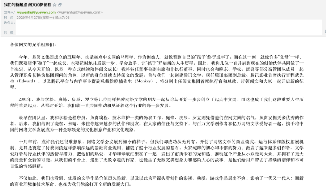 从4月27日上午业内已经听到消息,到当日盘后两封内部邮件公开,阅文对外确认了集团发生高层变动:现任联席首席执行官吴文辉和梁晓东、总裁商学松、高级副总裁林庭锋等部分高管团队成员荣退,辞任目前管理职务。吴文辉将调任非执行董事和董事会副主席,梁晓东和其他高管将担任集团顾问,助力管理团队平稳过渡,持续支持阅文战略发展。