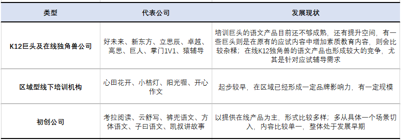 从“大语文”市场参与主体来看,目前语文培训领域有三类参与者:巨头独角兽、区域型线下机构以及初创公司。