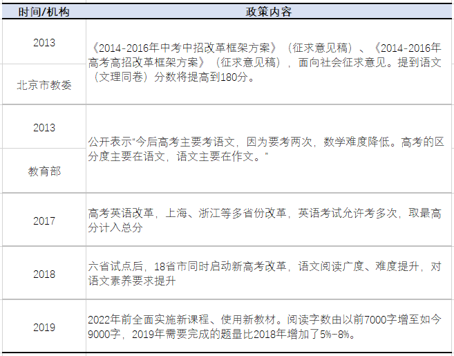 从教育部频繁出台的教育改革方案来看,中高考中语文分数占比加大,难度提升,这使得学生和家长对语文的重视和对语文培训的需求被提到了新的高度。