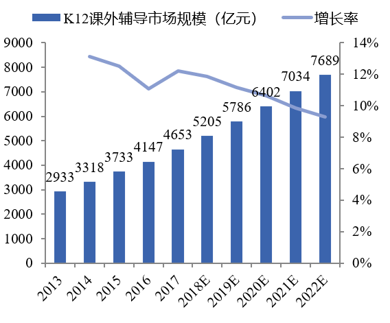 根据弗若斯特沙利文测算,预期到2022年,中国在课外辅导及备考方面的总开支达10537亿元,自2017年起的复合年增长率将为10.7%,领先GDP增速和教育总市场增速。