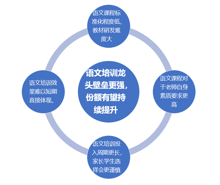 另一方面是师资考核体系不标准,语文培训教师素质要求高、培养难度大、测评难等,导致了语文培训市场在K12课外辅导当中一直占比较低。