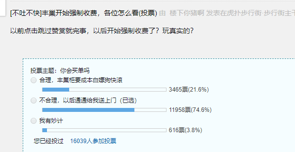 在虎扑,一个有关“丰巢快递收费”的投票,截至目前已有1.6万人参与,接近75%的用户表示“不合理,以后快递送上门”,只有21%的用户认为丰巢收费合理。