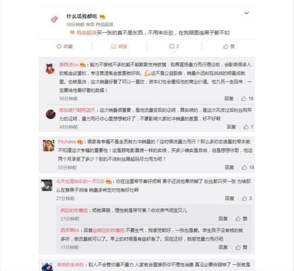 在肖战的粉丝群中,不花钱或花钱少的大多数都处于被群嘲的“鄙视链”底端,反之,起码买了上百张的才有资格“晒单”。一位粉丝直言,“买一张的真不是东西,不用来反驳,在我眼里连黑子都不如”,而底下拍手称快,一片叫好。她们的理由看起来也相当充分—“哥哥3个月没开工,还要打官司,他都受了这些多委屈了,你们就是这么表达爱意的”?