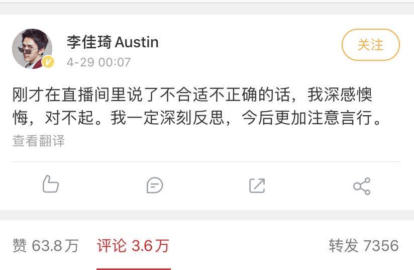 直播过去两小时后,李佳琦发布了一条不到50字的简短回应,表示“懊恼后悔”、“深刻反思”。