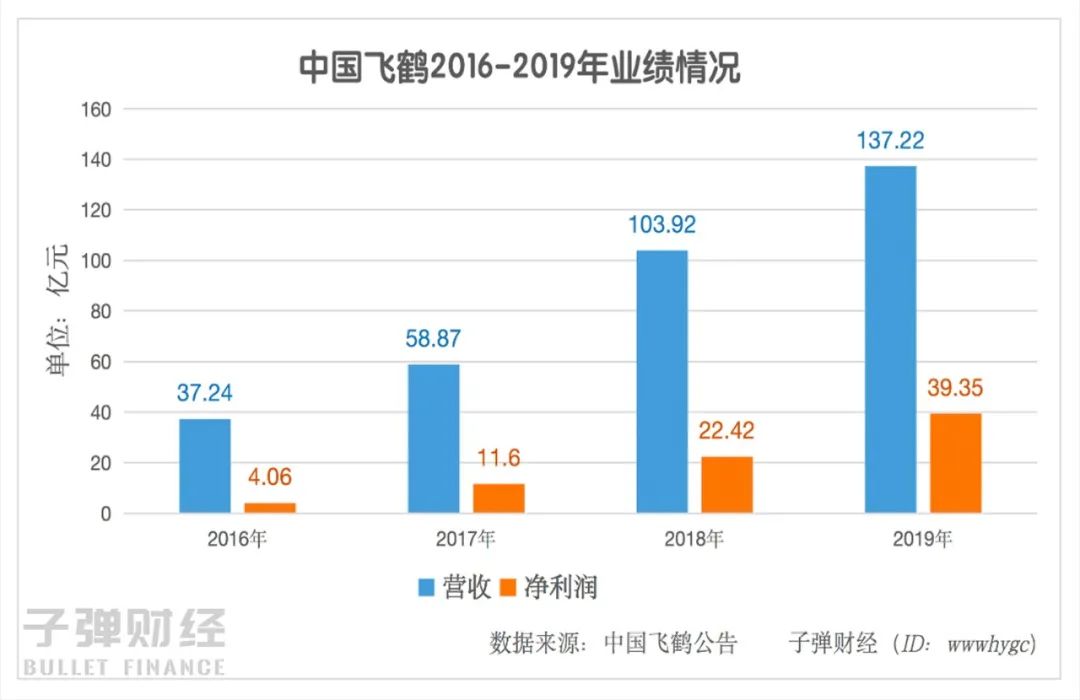 拉长时间跨度来看,飞鹤近几年业绩都处于持续增长状态。2016年-2019年,飞鹤的营收分别为37.24亿元、58.87亿元、103.92亿元及137.22亿元,净利润分别达到4.06亿元、11.60亿元、22.42亿元及39.35亿元。