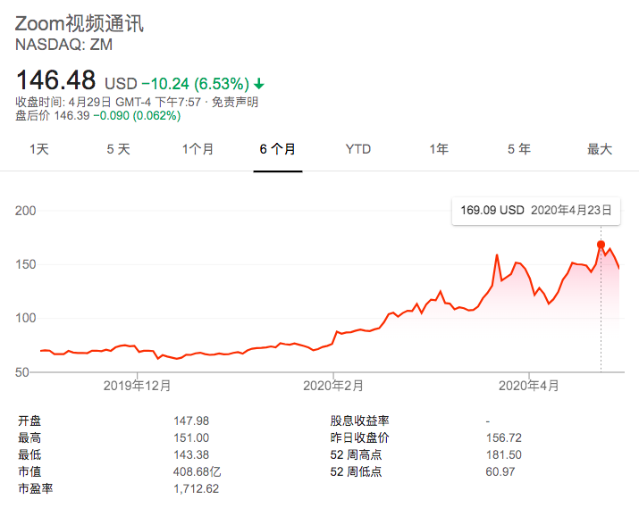 从今年2月3日起,因疫情带来的远程办公市场带动了Zoom股票飙升。此前Zoom的股价在80美元以下徘徊了4个月,经过一个半月股价就达到了164.94美元(3月23日),市值翻倍。哪怕在3月中旬,美股10天4次熔断创造历史时,Zoom也是一片红间少有的一点绿。