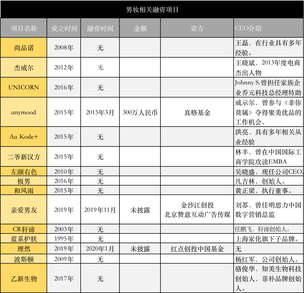 铅笔道在天眼查官网中查询发现,近年来与“男妆”有关的创业公司并不多,且基本以未融资状态为主,即使有新一轮股权变更,也都显少披露融资额。目前,公布信息最完整的是2015年获投的anymood,融资300万元,投资方是真格基金。而去年和今年,该赛道又分别出现一起融资事件,金沙江创投、红点创投中国基金先后入局。