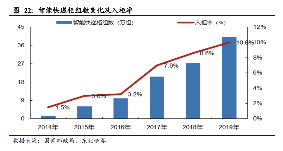 无人快递柜和取餐柜则是在提高快递物流最后一公里的服务效率,减少派件过程中因为用户时间、配合度等等问题,耽误的人力与时间成本,以此提高人效;