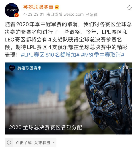 前不久,拳头官方决定取消今年季中冠军赛的举行,并且增加S10的赛区参赛名额,而LPL凭借过去两年的优异战绩,名额增加至四支战队。