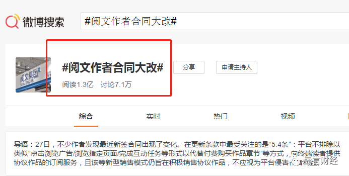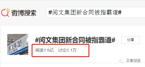 在微博,话题#阅文作者合同大改#的阅读已达1.3亿,讨论7.1万;话题#阅文集团新合同被指霸道#阅读达1.6亿,讨论5.1万。