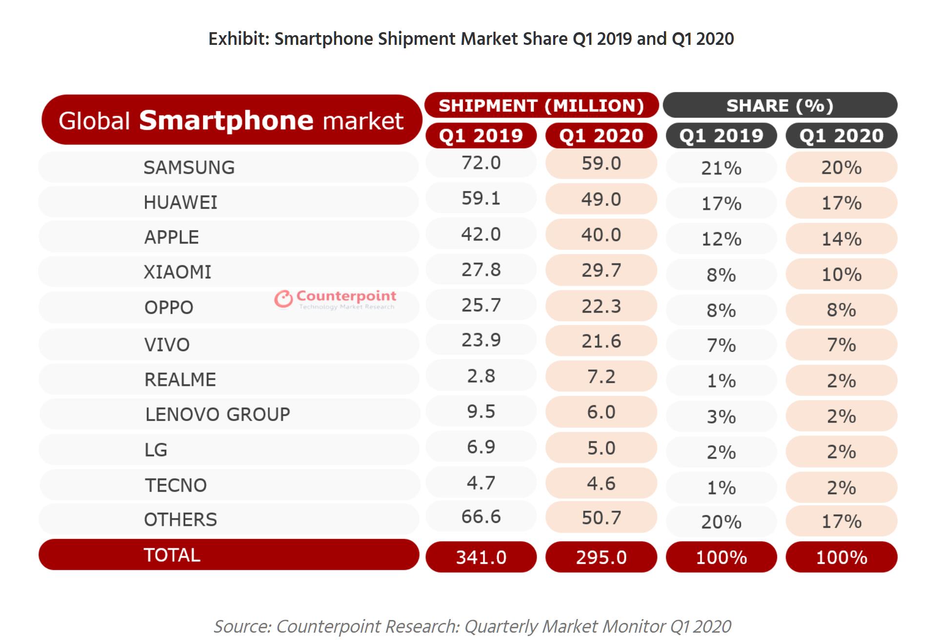 不过,此前,Canalys曾发布报告称,在最坏的情况下,印度智能机市场全年将下滑4.2%,最好的情况下也仅是同比增长3.2%。而市场研究机构Counterpoint Research也预计,印度的封锁令将让印度手机市场第二季度出货量下降接近60%,全年下滑10%。但从今年第一季度它们各自发布的销量报告看,可谓是大相径庭。也许是今年厂商和统计机构在印度智能手机市场玩出货量数字游戏最后的疯狂。