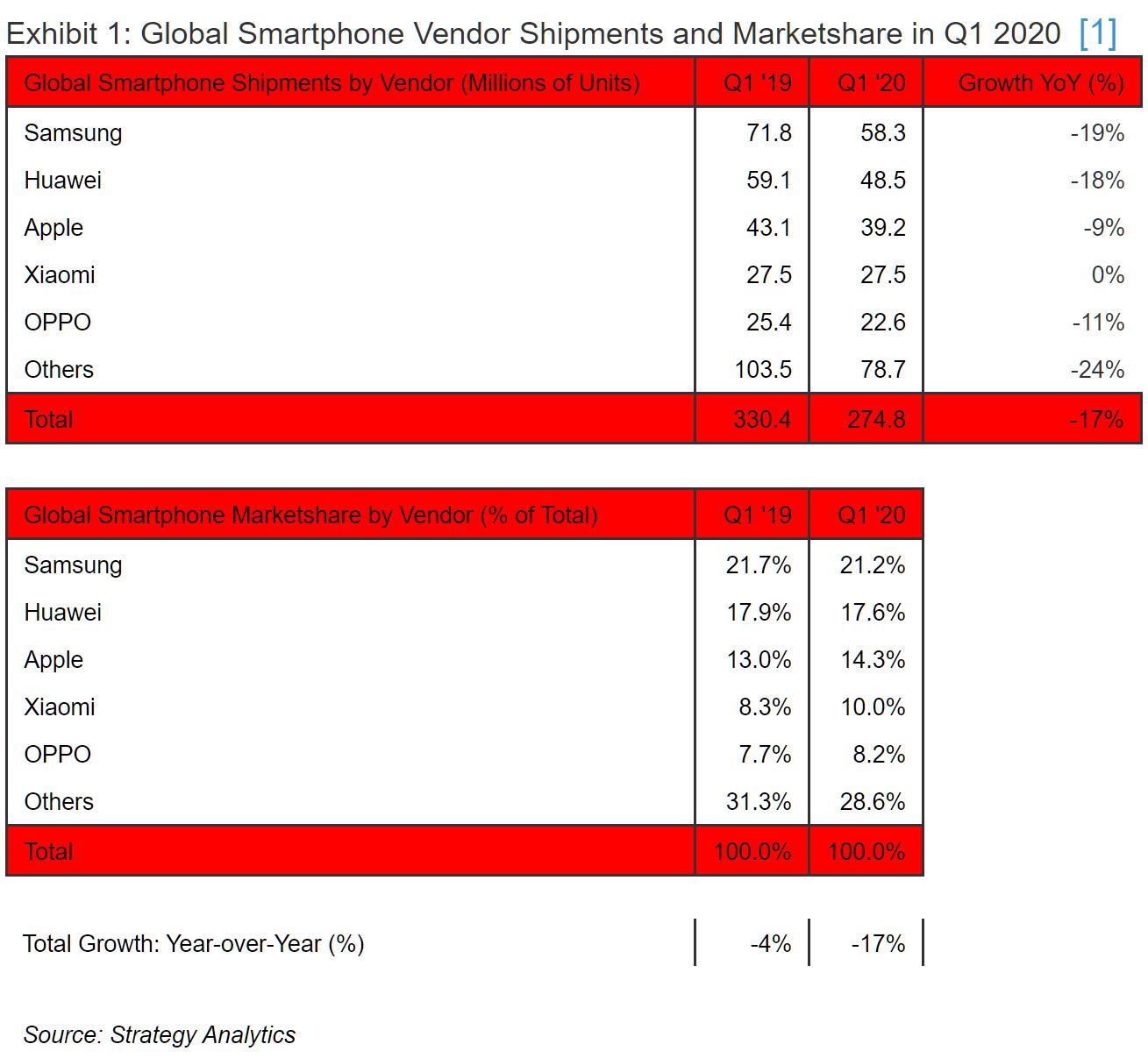 正是由于上述中国和印度这两大全球智能手机市场的“乱“,最终导致统计机构对于今年第一季度全球智能手机市场的统计也是”乱“声一片。尤其是对于小米、OV,在中国市场大跌和印度市场统计存疑的情况下,依然出现了乐观和悲观派两种截然不同的统计结果。