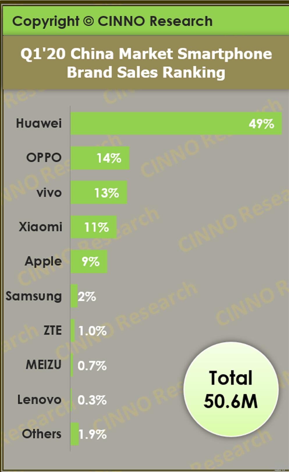 另外,从同比增长率看,CINNO Research虽然没有具体数字予以说明,但在其说明销量的解释中称,华为是同比大幅下滑。而两家国外机构的统计也出现了较大差距,其中Counterpoint的统计是同比增长6%;Canalys仅为1%,虽然都是同比增长,但Counterpoint统计的华为手机的同比增长率达到Canalys的6倍。