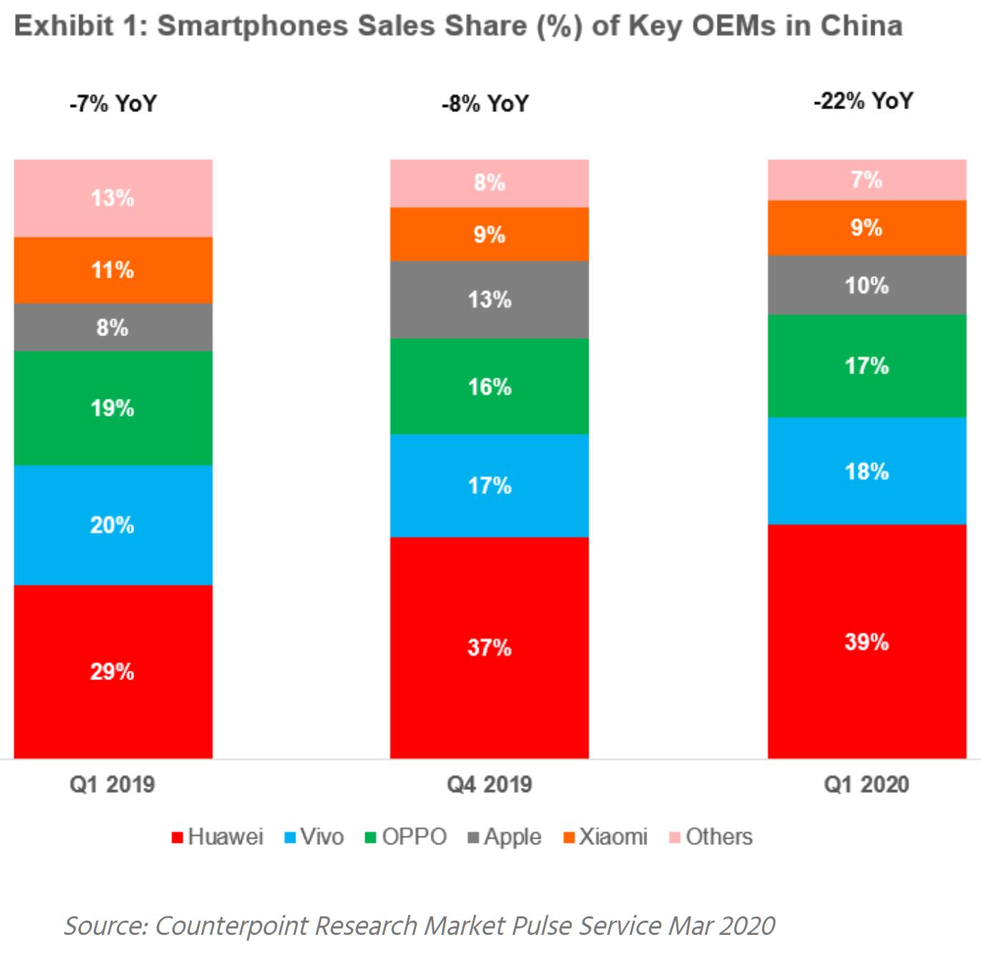 我们先来看看两家国外统计机构对于中国智能手机市场整体的统计情况。据Canalys的统计,一季度中国智能手机市场整体出货量为7260万部;同比下滑18%;Counterpoint因为没有整体出货量的具体数字,只公布了同比下滑22%。