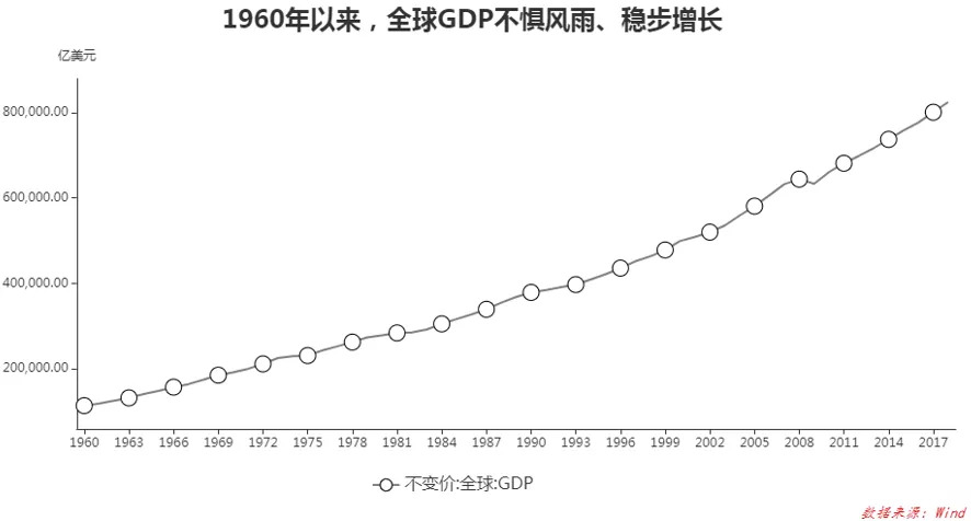 风物长宜放眼量。1960年以来,全球层面发生过大大小小的危机和灾难,全球GDP却能不惧风雨、稳步增长,偶有一两年停滞或下滑 ,总能很快回归增长。