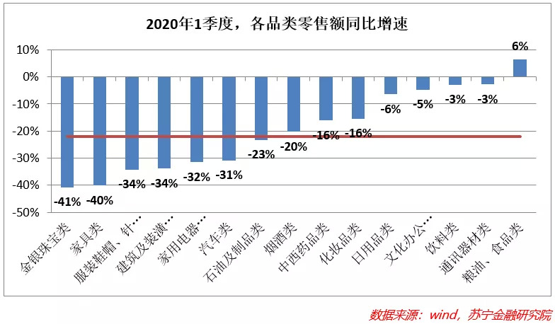 2020年1季度,商品零售额同比下降22%,其中,粮食食品零售额保持正增长,通讯器材、饮料、文化办公用品和日用品同比降幅有限,而金银珠宝类、家具类、服装鞋帽、家用电器等产品,需求出现明显滑坡。