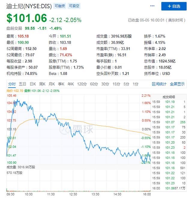 在财报发布之后,迪士尼在周三开盘前,其盘后股价为98.97美元,盘后下跌2.07%。目前,迪士尼盘前交易仍然下跌1.49%,市值为1824.58亿美元。