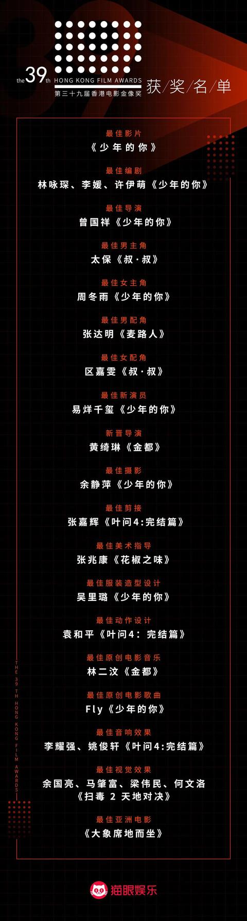 附第39届金像奖完整获奖名单(图片来自猫眼娱乐):