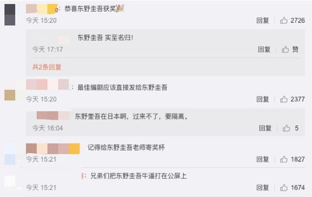 现在《少年的你》获得了金像奖最佳编剧奖,对于反对抄袭行为的读者而言,这个奖项显得有些讽刺。网友纷纷留言,“演员很棒,但是恭喜东野圭吾”“记得给东野圭吾老师寄奖杯”。