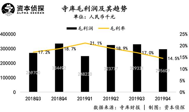 2019年第四季度,寺库的毛利润为2.96亿元,同比下跌11.6%;毛利率为14.5%,上年同期和上一季度分别为18.7%和17%,毛利率呈现持续下滑趋势。