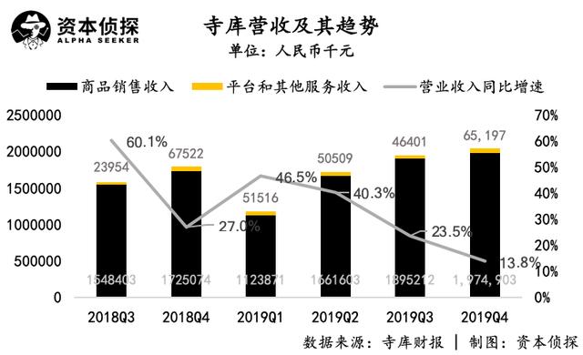 GMV增速的下滑对应着营收的增长困境,2019年第四季度,寺库的营收为20.4亿元,低于业绩指引区间下限。在整个2019年,寺库营收的季度增速持续下滑,四季度13.8%的增长大幅低于此前水平。
