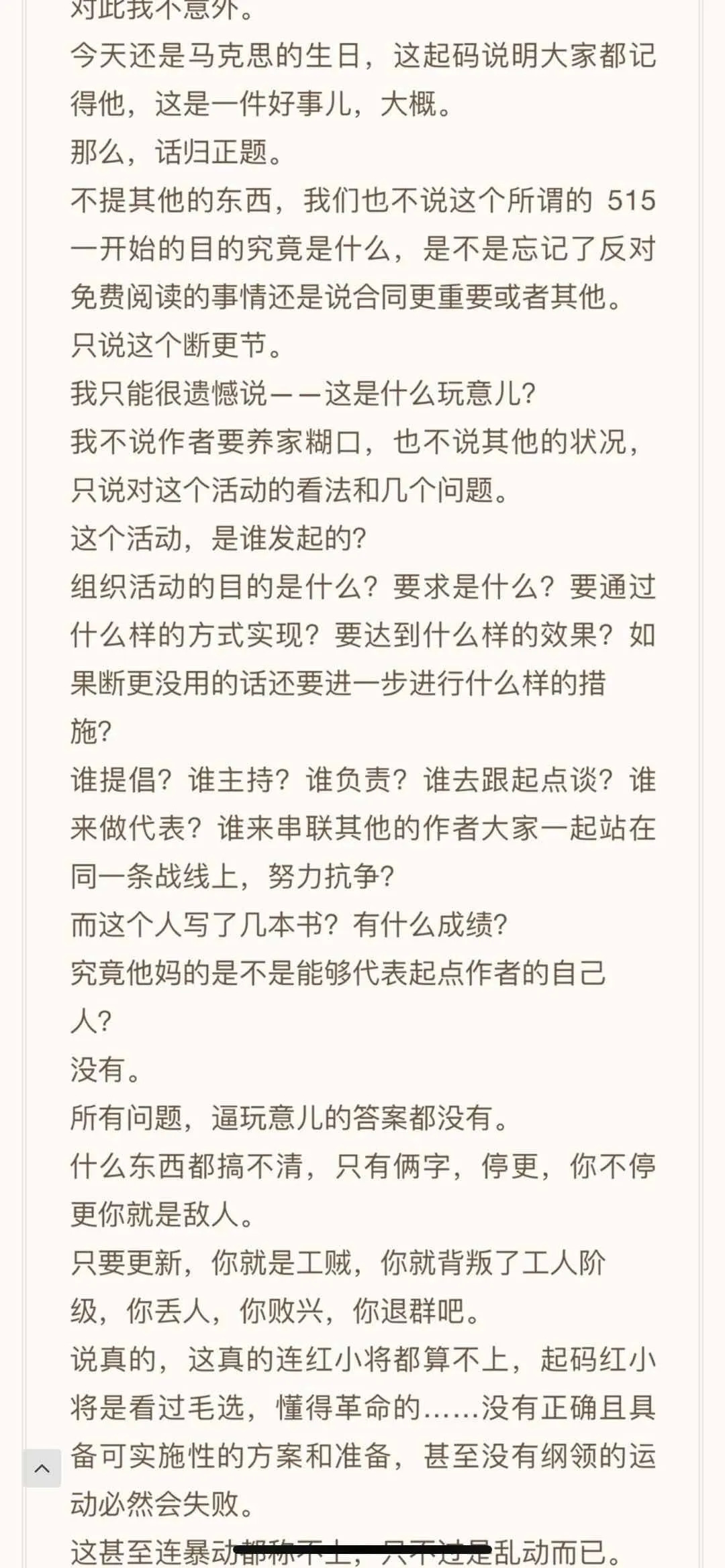 不过,正常更新的作者尤其是知名作者遭遇到特别的“招待”。知名网文作者风月在5月5日正常更新文章后,被部分网友质疑、攻击和辱骂,不得不发单章并在其微博中做了说明,以及对所谓的“断更节”谈了几点看法,大概就是质疑了“断更节”的目的、方式以及裹挟式的参与手段——之后,果然被少数网友围攻。