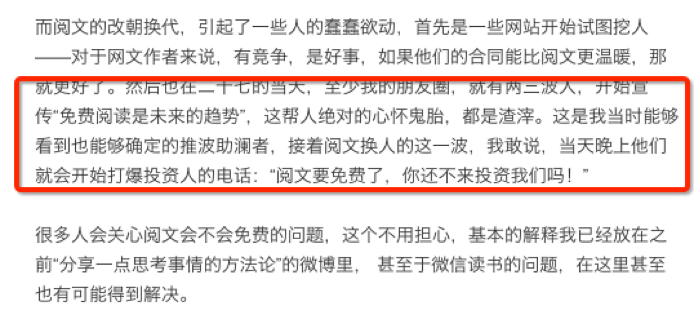 首先,知名作者。他们更关注行业的发展趋势,关注的是免费和付费,以及合同中关于版权的诸多细则的约定——很多被围攻的网文作者,其实都针对这些合同中的关键问题和平台有过沟通并且在网络中发过声的,其中,微信读书针对阅文版权内容也已经被快速的解决。