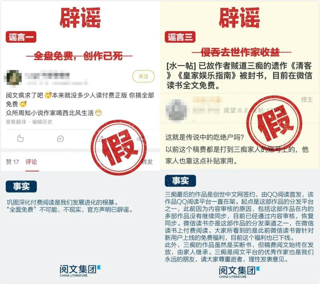 5月5日当晚,阅文集团发布澄清声明,针对传闻的“全面免费”、“占有作者版权”、“侵吞去世作者收益”等六大“谣言”进行回应,在之后的恳谈会上也再次做了说明,并呼吁大家明辨真假、理想发声。