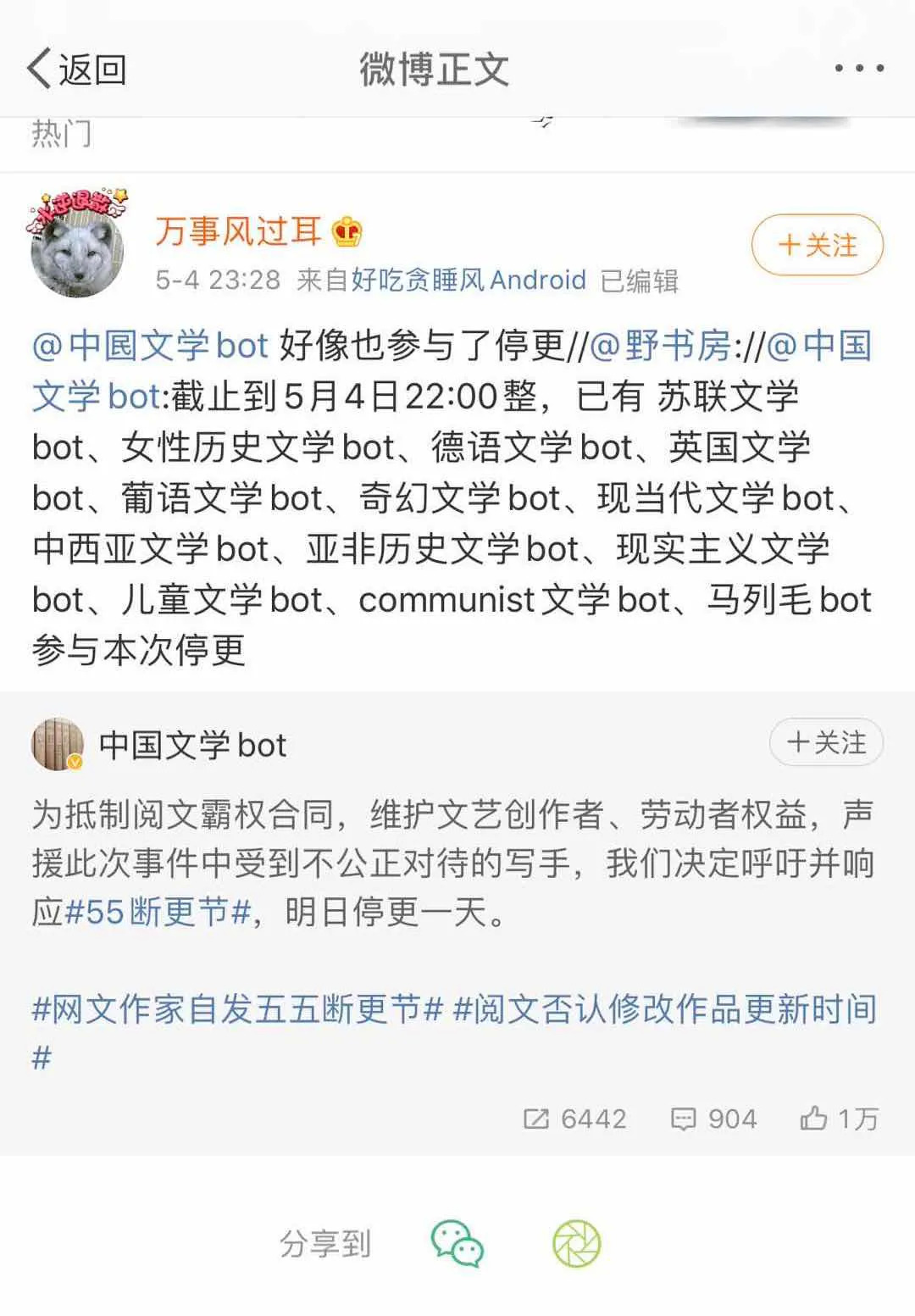 五一期间,社交网络中一度盛传所有网文作者将要在5月5日这天断更,也就是所谓的“五五断更节”,这也被解读为阅文高管更替引发的舆情风波有“愈演愈烈”的可能。