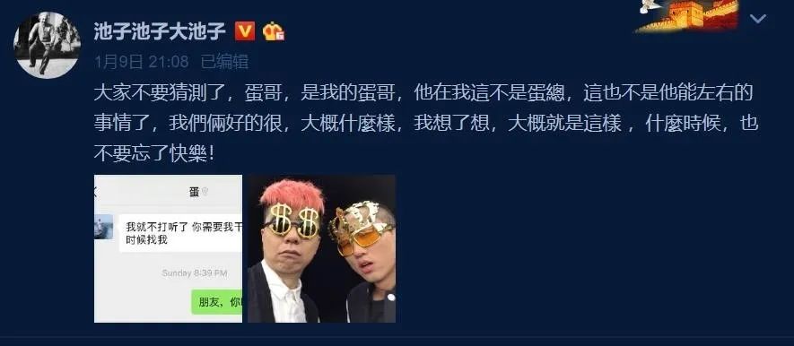 就在2019年池子宣布退出《吐槽大会》两天后,他晒出了被笑果文化CEO贺晓曦移出群聊的截图,引起了大家对“池子离开笑果文化,与李诞闹掰了”的猜测。