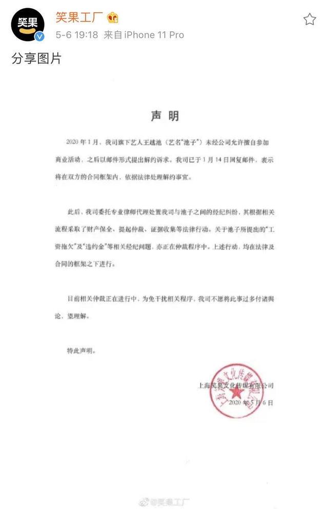 1月9日,池子爆料自己被移除公司群聊,拉开了与公司的第一次矛盾公开化的序幕。笑果CEO贺晓曦随后在个人微博发布公司声明,证明今年1月初池子已经正式提出解约,公司也将按照流程办理相关事宜。