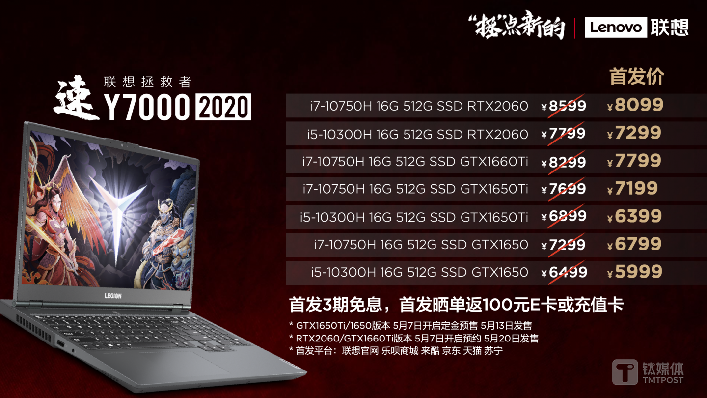 联想拯救者系列全新产品将在线上和线下全渠道销售,联想拯救者Y9000K 2020笔记本首发价10999元起,拯救者Y7000P 2020笔记本首发价8699元,拯救者Y7000 2020笔记本首发价5999元起,拯救者R7000 2020笔记本首发价5199元起。