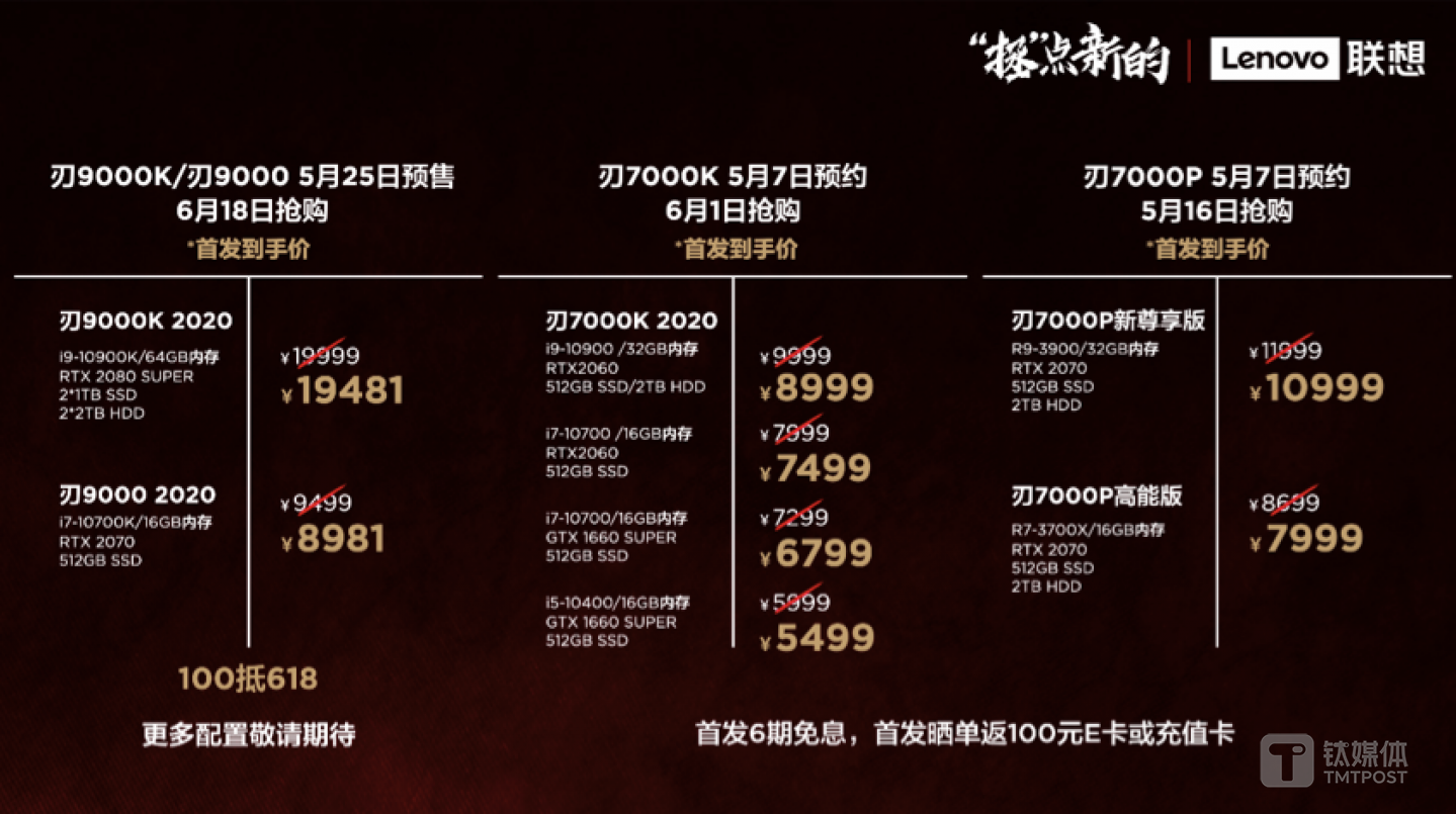 台机产品拯救者刃9000K/刃9000电脑5月25日预售,6月1日抢购,首发到手价分别为19481元、8981元,拯救者刃7000K电脑 5月7日预约 6月1日抢购,首发到手价5499元起,拯救者刃7000P 电脑5月7日预约 5月16日抢购,首发到手价7999元起。