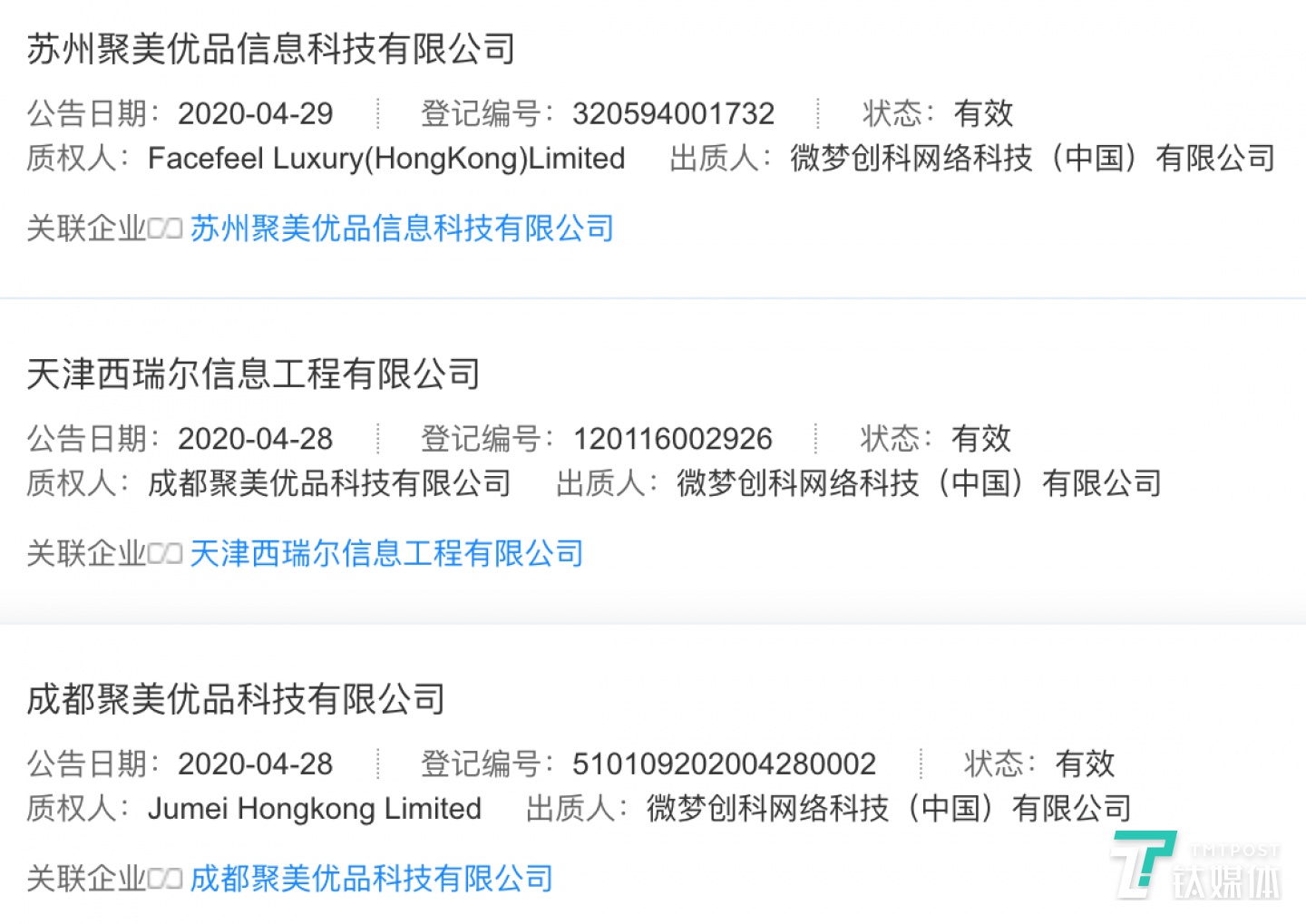 5月6日,天眼查消息显示,4月28日至4月30日,微梦创科网络科技(中国)有限公司(新浪微博运营实体)作为质权人连续完成4次股权出质,其中三次的出质人均为聚美优品相关公司,分别为Facefeel Luxury(HongKong)Limited、成都聚美优品科技有限公司以及Jumei HongkongLimited。