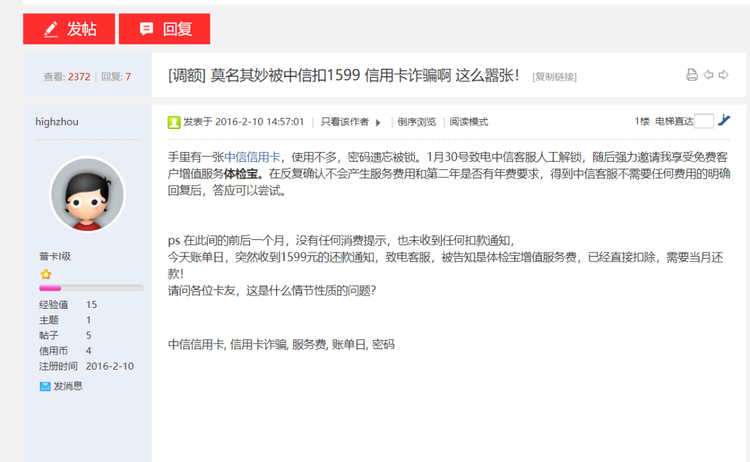 在“我爱卡”等相关信用卡社区,至今仍留存有多条关于中信银行信用卡替卡主“消费”的网帖,且多指向一项名为“体检宝”和“我爱我家”的增值服务。