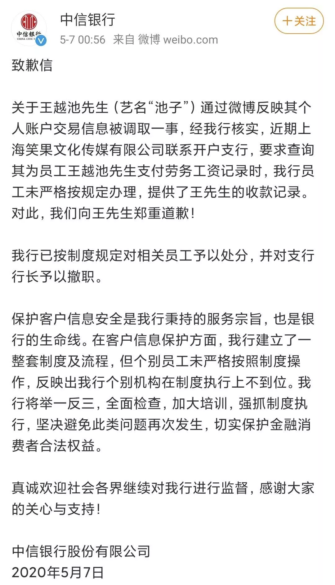 5月7日凌晨,中信银行紧急向池子道歉,并祭出“撤职行长”的处分决定强行挽尊,暗示调取池子个人银行账户交易信息一事是员工个人行为与中信银行无关,成功甩锅。