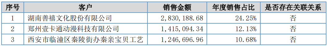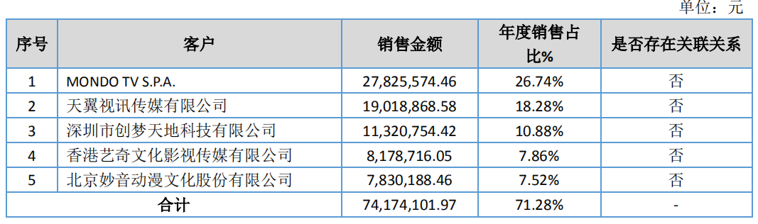 国学德育类动漫制作公司妙音动漫主营项目垂直,以《中华弟子规》、《孝孝龙奇幻记》两大系列IP资源为主,受众群体与流行动漫作品相比较小。加之在受托动漫制作领域,公司的经营策略是以承接大型项目为主,因此报告期内公司前五名客户销售金额占当期营业收入的48.11%,呈客户集中态势。不过,在妙音动漫9066.24万的营收中,版权产品授权占72.67%,而公司拥有稳定的IP资源,因此整体的风险概率也会相对较小。