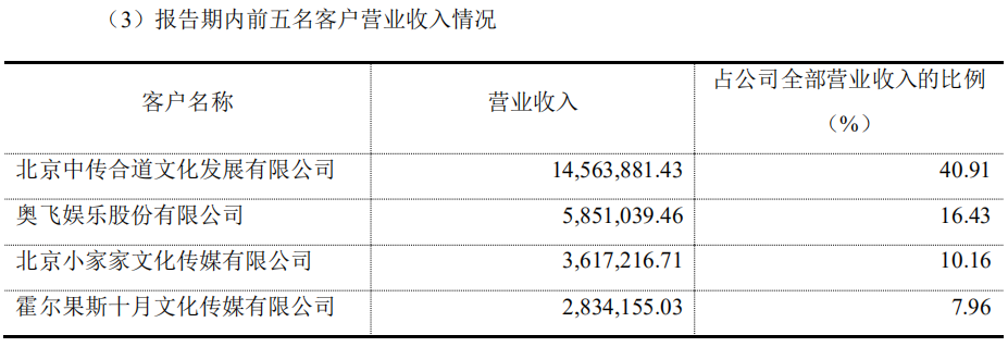 同样以版权分销为主营业务的森宇文化,因公司的原创制作项目较少,主要客户多为有线电视网络运营商、IPTV 运营商及 OTT TV 运营商,导致报告期内,公司前五大客户实现收入在主营业务收入中的占比为 70.16%。不过,为了扩展销售渠道,森宇文化在报告期内新增了酒店业务收入,但因业务落实时间不久,在2019年内仅获得了1.6万的营收。