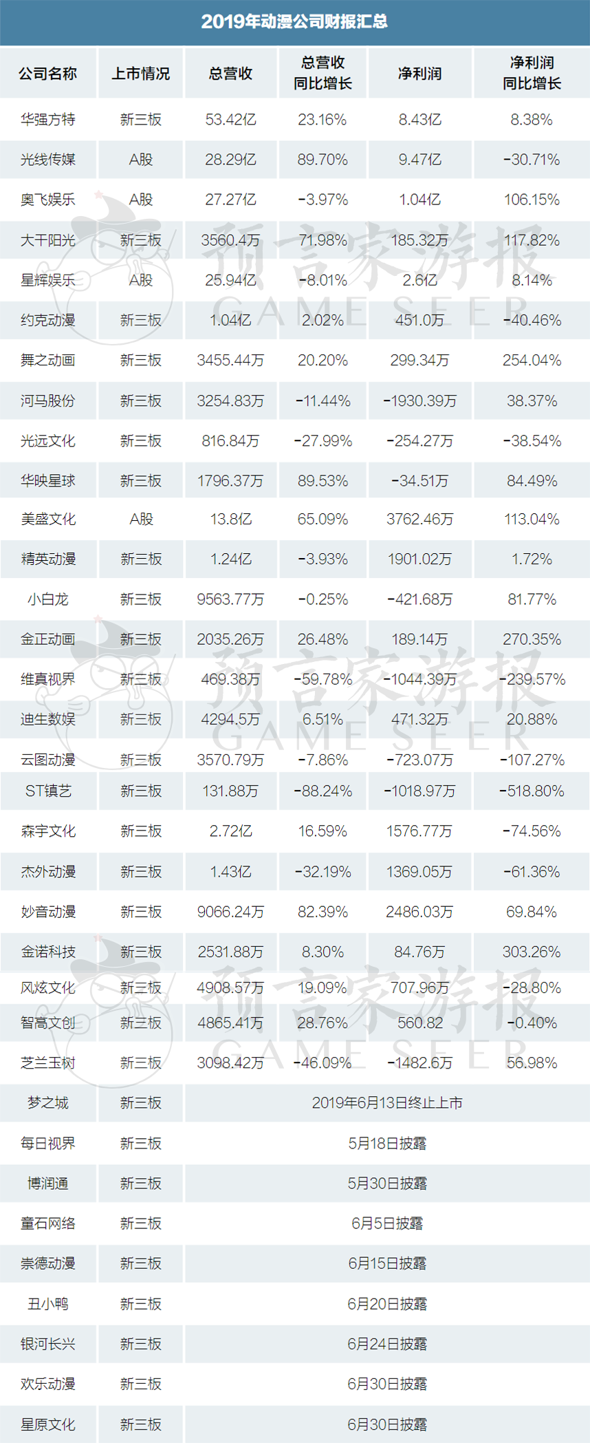 其中还有8家公司的净利润为负数,以动画影视制作为主的河马股份的净利润最低,为-1930.39万元。去年参与创作《魔晶猎人》第五季和《爱在西元前》两部上线视频平台作品的老牌动画公司华映星球,其净利润则只有-34.51万元。